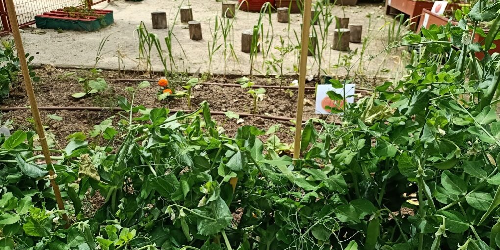 Habas y guisantes: dos leguminosas que nos maravillan en el huerto escolar, ya que además de los frutos en forma de vaina que nos encantan, mejoran el suelo fijando nitrógeno gracias a la bacteria Rizhobium. Aún las podemos mantener en el huerto un poquito más para seguir cosechando.
